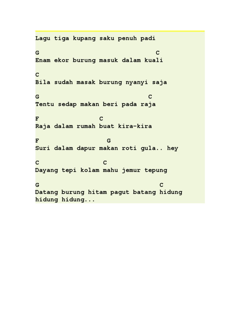 C lagu tiga kupang saku penuh padi g c enam ekor burung masuk dalam kuali c bila sudah masak burung nyanyi saja g c tentu sedap makan beri pada raja f c. Lirik lagu tiga kupang lagu tiga kupang. Go into a frying pan.